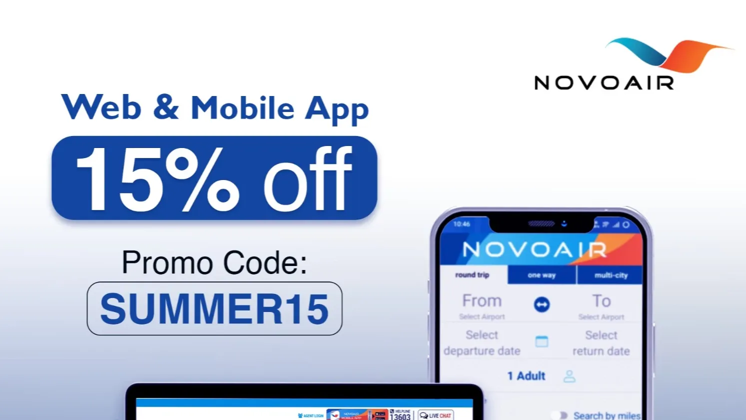 Passengers will enjoy a 15% discount on ticket (base fare) purchases made through the NOVOAIR website and mobile app by using the promo code ‘SUMMER15,’said a press release issued on Thursday.